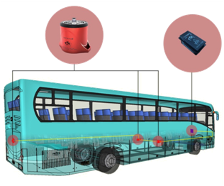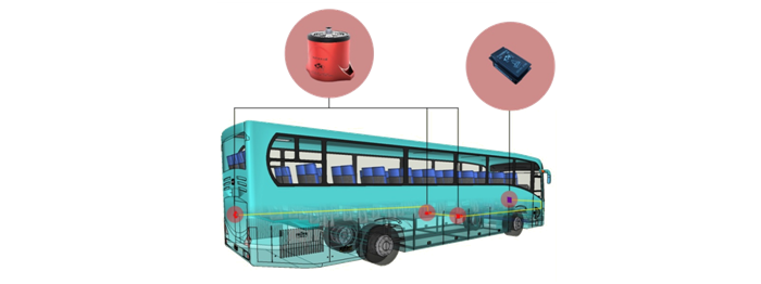 設計案例:江西百路佳新能源6.5米長客車,內有電池艙5個,故需設計的保護區為5個保護區,每個保護區配置1臺自動滅火裝置(型號QRR0.03GW/SHS-AR23ZF),5個保護區內的5臺裝置通過總承線束和駕駛員操作盤上的模塊聯接。