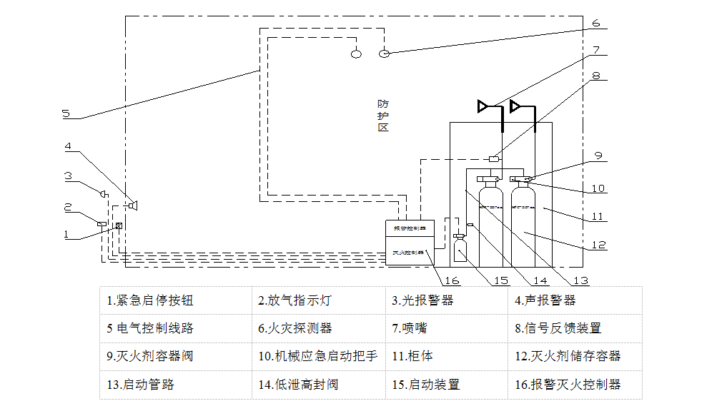 ● 該裝置的啟動(dòng)方式為自動(dòng)控制、手動(dòng)控制和機(jī)械應(yīng)急手動(dòng)控制三種。一般情況下應(yīng)使用手動(dòng)控制,在防護(hù)區(qū)無(wú)人的情況下可以轉(zhuǎn)換為自動(dòng)控制,當(dāng)自動(dòng)控制和手動(dòng)控制不能執(zhí)行時(shí),應(yīng)采用機(jī)械應(yīng)急手動(dòng)控制。